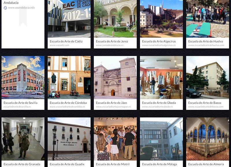 Pues para probar este invento, he creado un notebook con las direcciones web de todas las Escuelas de Arte de Andalucía que he encontrado hasta este momento. Bueno, Huescar no tiene página web, la de Granada es de Arrakis, y la de Cádiz ahora tiene una splashpage que me ha costado horrores, pero al final he conseguido incluirla también. En general, unas webs bastante pobres para la calidad de la enseñanza que ofrecemos a nuestra sociedad.
