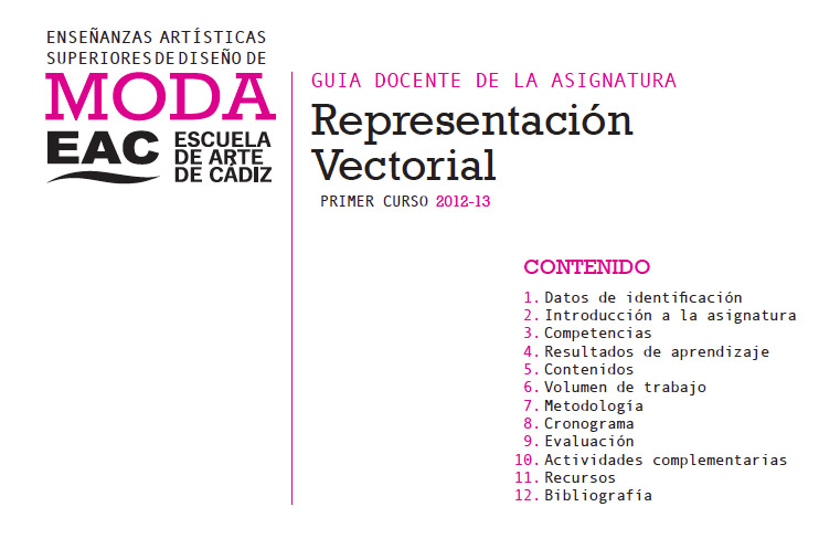 Uno de los complementos obligatorios para el alumno es la Guia Docente de cada asignatura, pues bien, desde aquí podéis descargar la de la asignatura que imparto, Representación Vectorial, para el curso 2012-13.